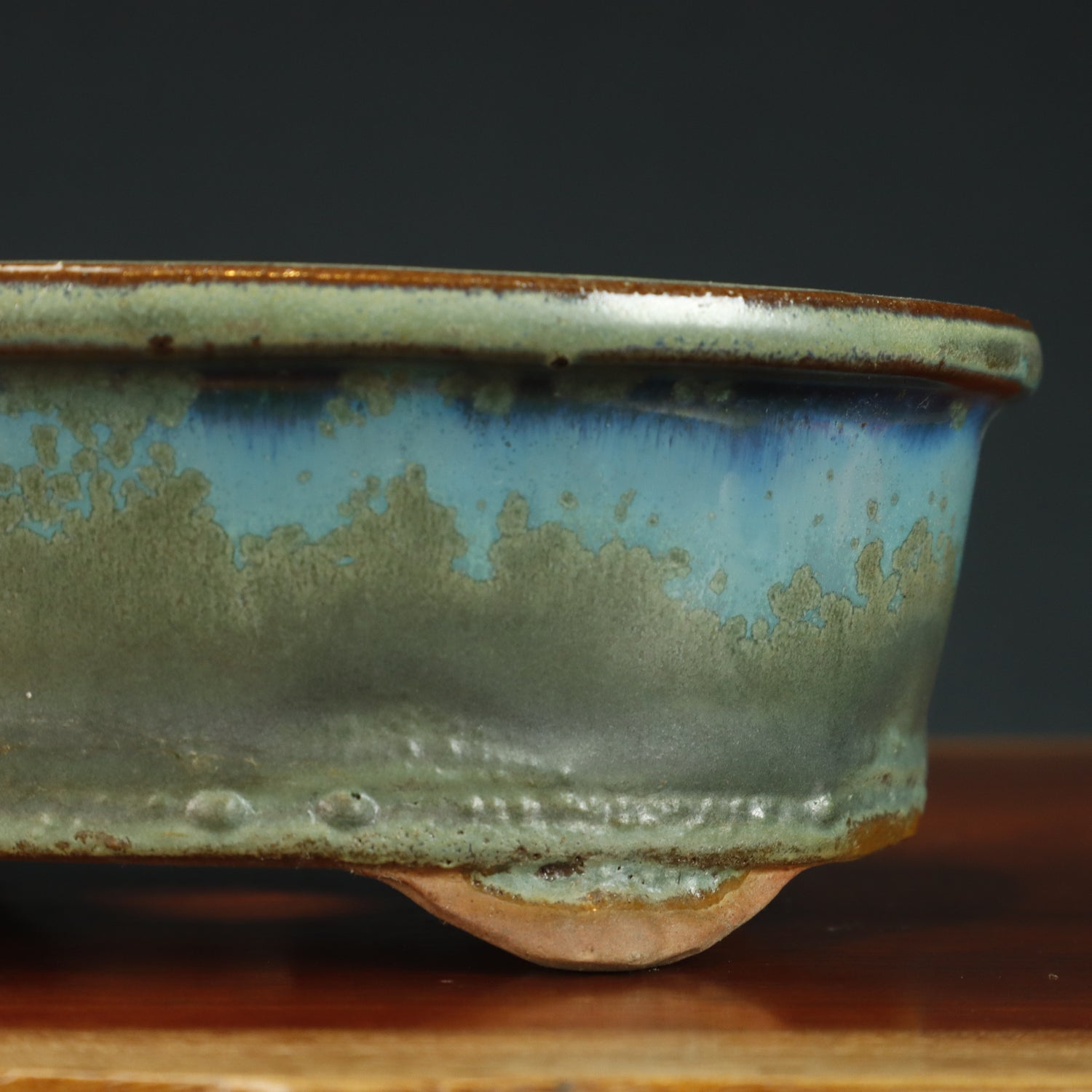 This glazed oval bonsai pot has a really nice industrial looking glaze to it, it almost looks like some corrosion.