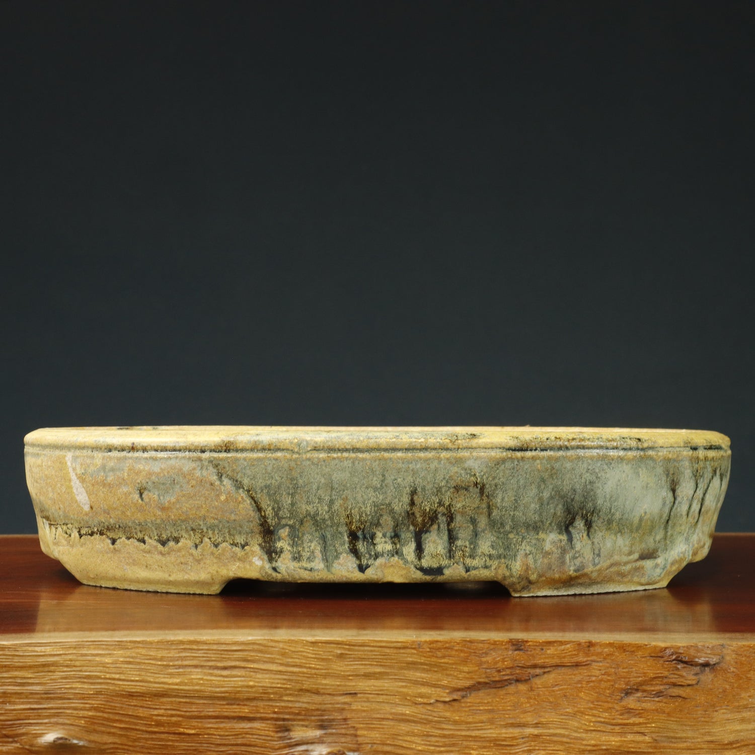 This hand made oval bonsai pot features a nice drip style glaze on 1 side and a plain glaze on the other side so you will have 2 options of which side you want as the front.