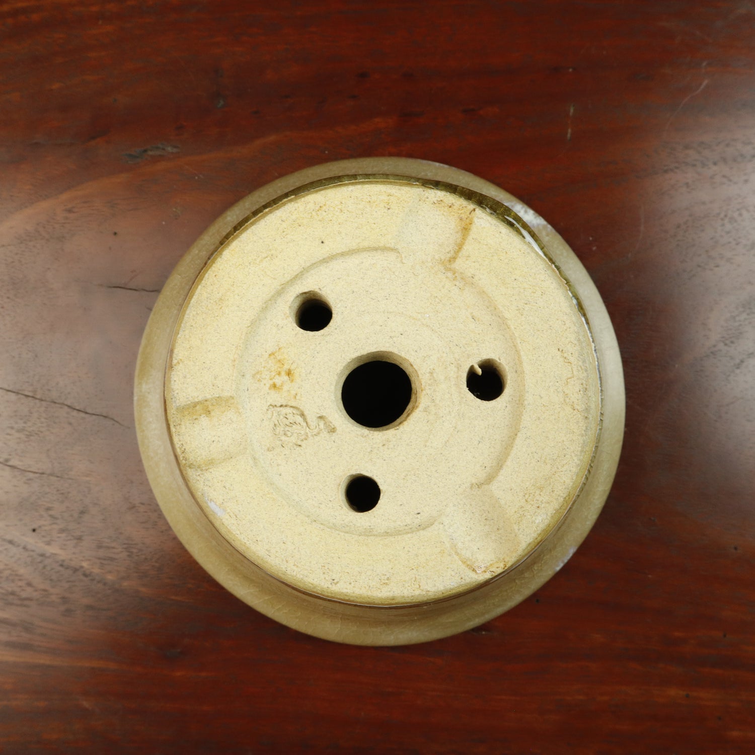 This round hand made bonsai pot features a nice crackle glaze that has a high shine to it. It also features some drips of secondary glaze from the lip